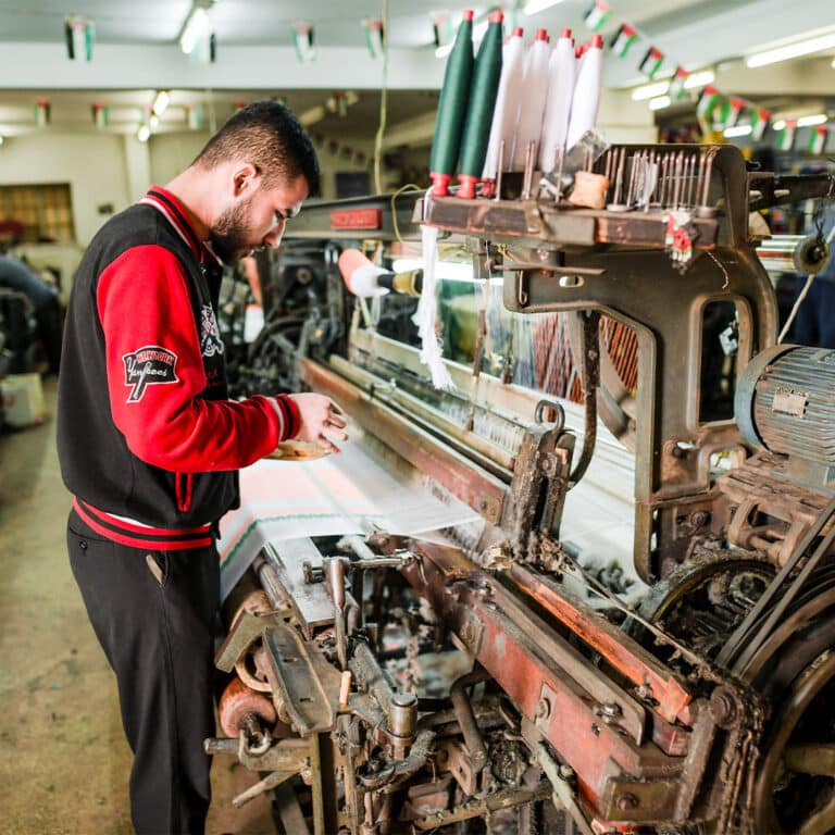 The kufiya is traditionally woven on two layers, the “base”, and the “pattern” or “flower” ( وردة) in Arabic. The looms must be monitored constantly. The threads between the patterns are cut manually while the machine is running. After the roll of Kufiyas is woven by our machines, they are sewn into individual Kufiyas and the iconic tassels are added.