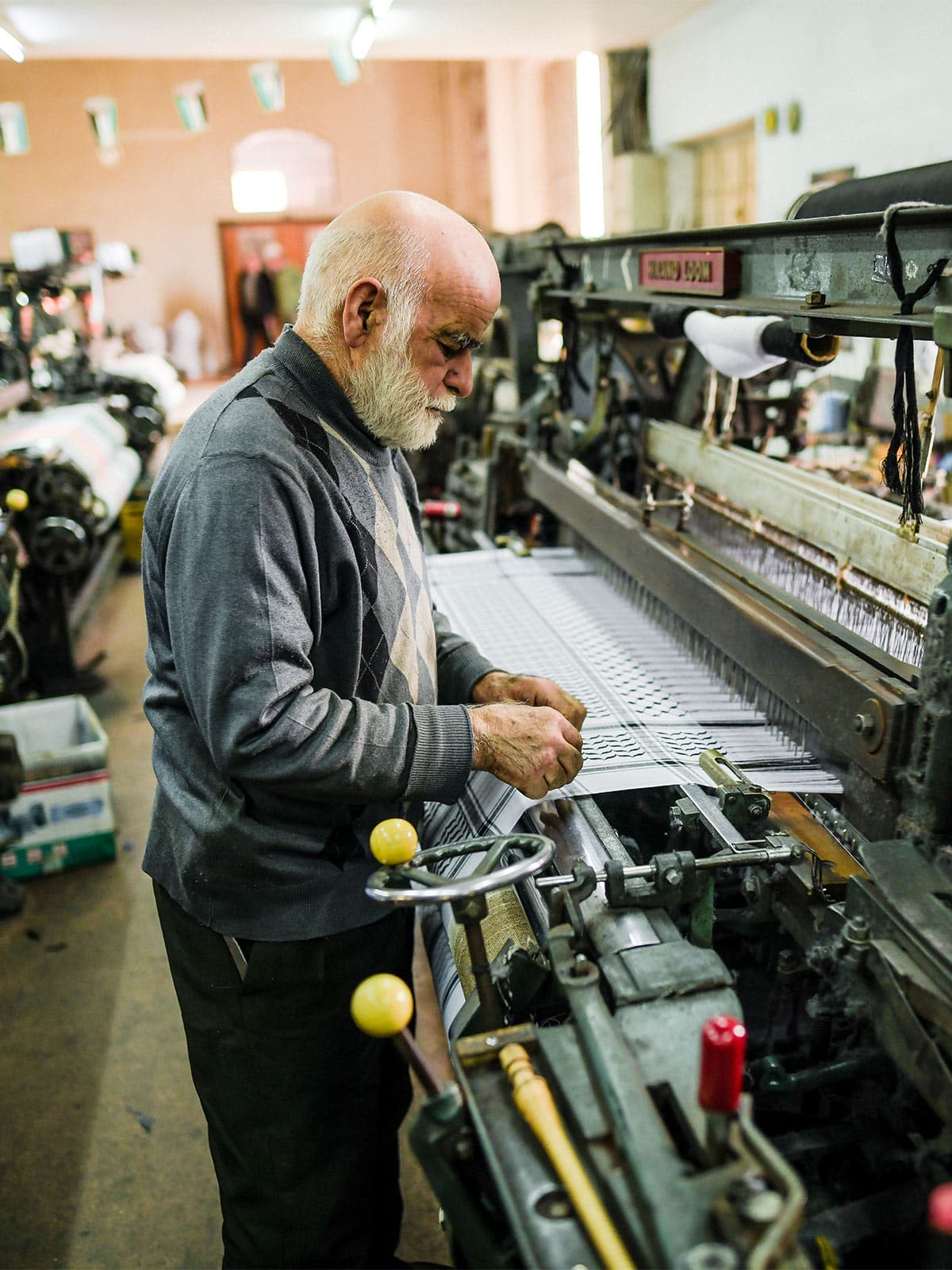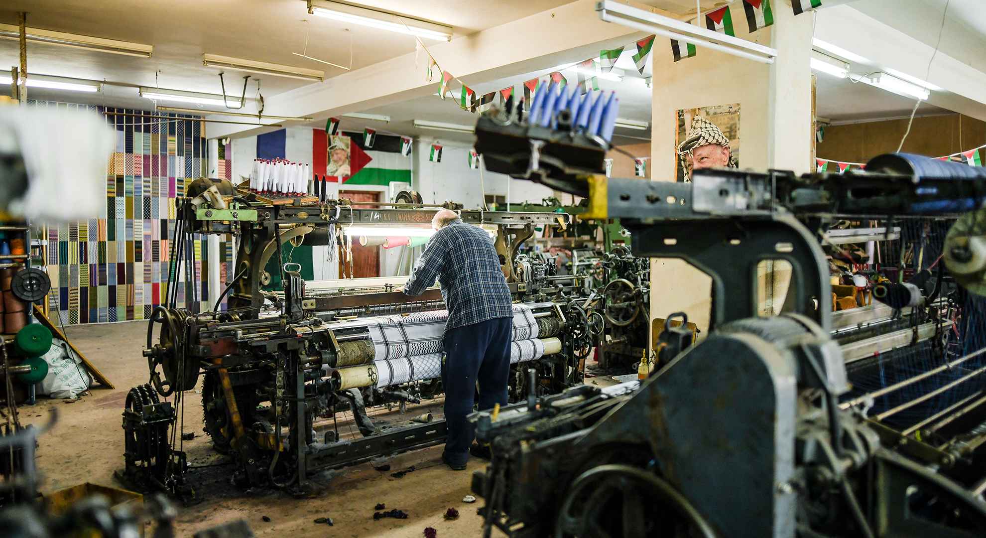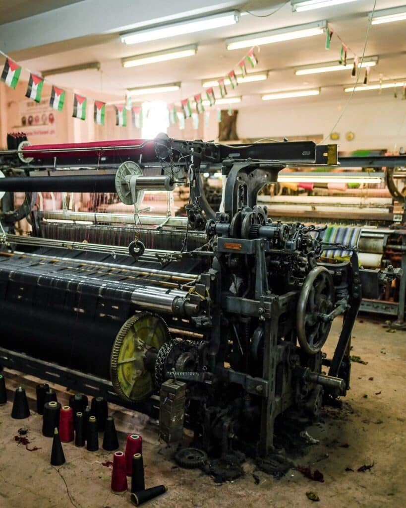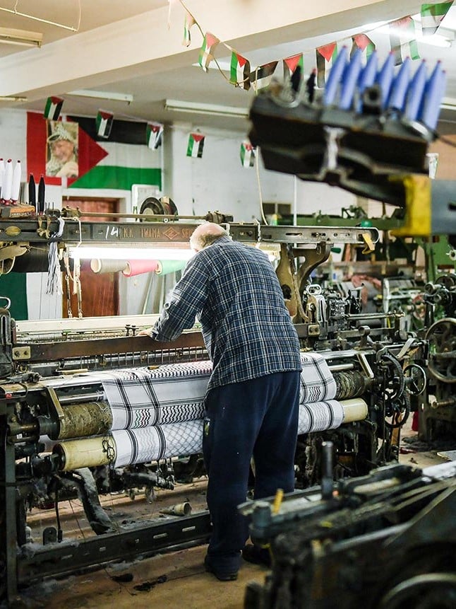 Tucked away in a quiet neighbourhood in Hebron, one of Palestine’s largest cities in the West Bank, the steady drumming of machinery spills out from a small, unassuming backroom shop. Here lies the Hirbawi Textile Factory. With its busy production line, day and night its local Palestinian artisans are continuously weaving authentic kufiyas, in a variety of colours and local patterns. Keeping the tradition alive, the Hirbawi Kufiya is the only Kufiya to be authentically made in Palestine.