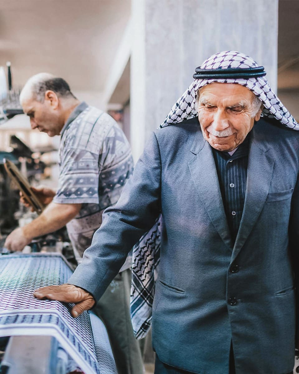 Yasser Hirbawi opened his historic factory in 1961. Remaining faithful to the traditional techniques, each kufiya is still designed and produced at the factory to this day. The Kufiyas are handmade using a specific cross-stitching honed to perfection over the decades. Only a handful of people still hold the generational knowledge of this time-honoured technique, which can be easily felt by the quality of the material and stitching.