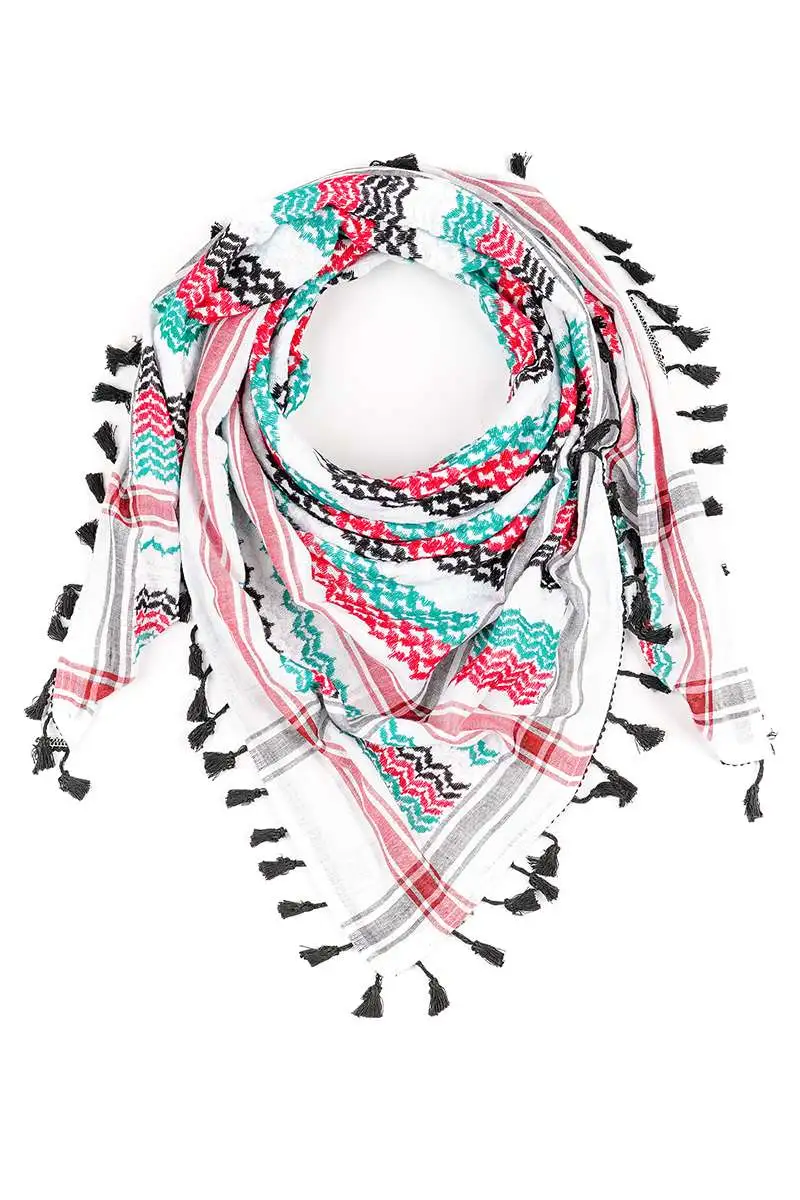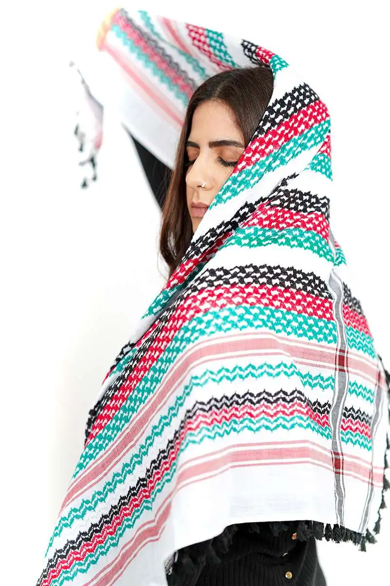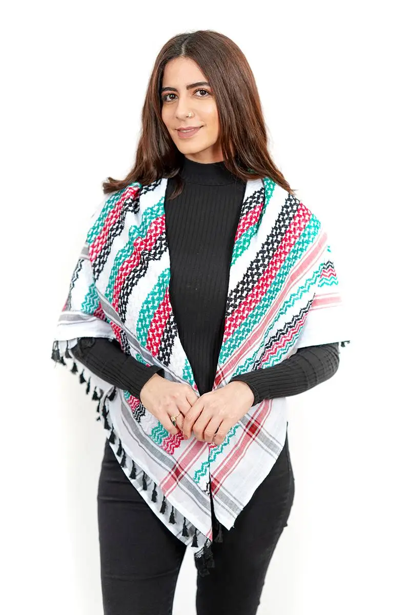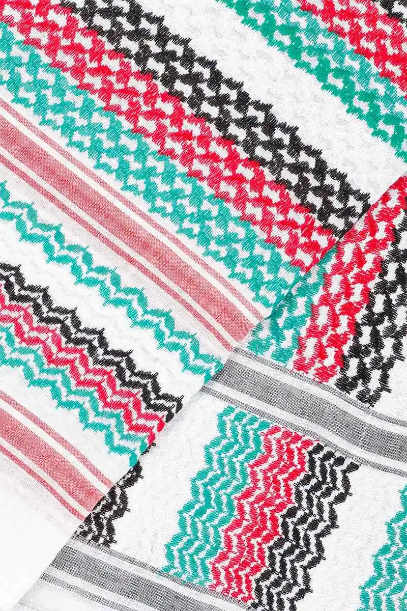 Brandish the vibrant Hurriya Freedom Hirbawi® Kufiya. A creative interpretation of the colours of the Palestinian national flag, Black, White, Red, and Green, symbolising the ongoing struggle of all Palestinians to break free. To live in dignity, to move freely and to raise our children without fear, and not be shackled from within an open-air prison. Hurriya is the struggle for our liberation.