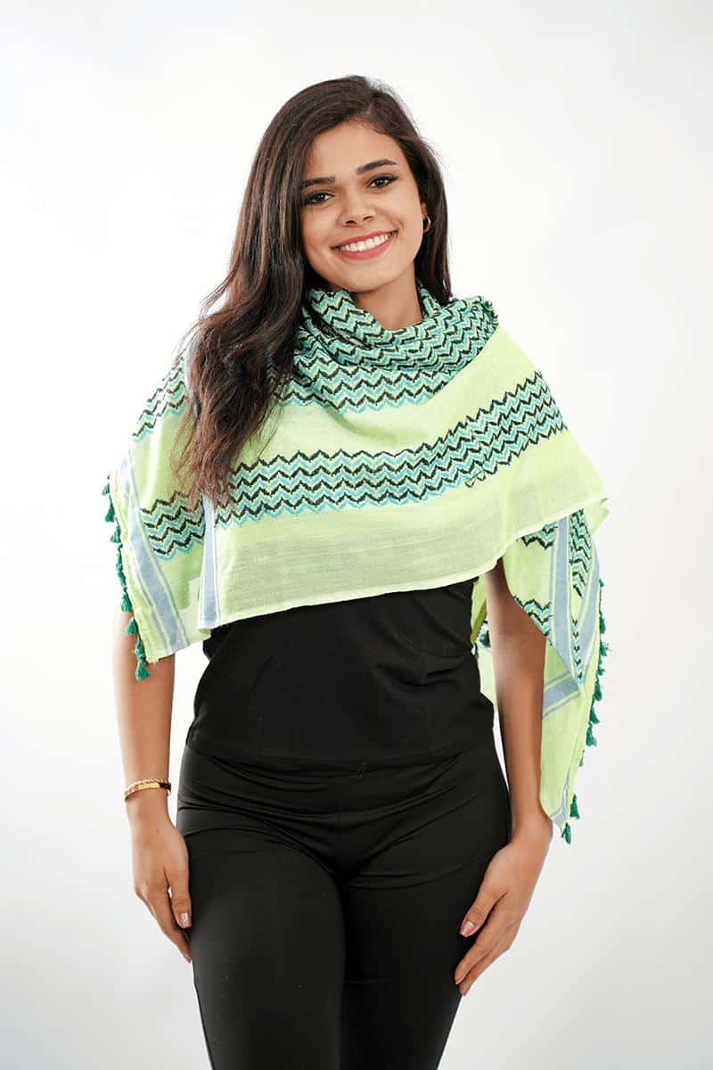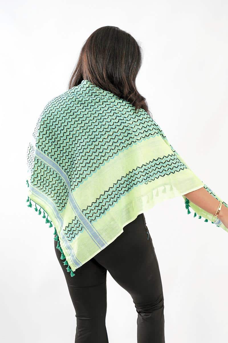 The green threads of the Sheikh Jarrah (الشيخ جراح) kufiya represent the deep roots of the Palestinian families who have lived in this neighborhood of Jerusalem for generations, building homes, raising families, and creating a community that has stood the test of time. Against all odds, the families of the Sheikh Jarrah neighborhood gained international attention, when they stood up against sinister efforts by Israeli authorities to evict them from their homes. This kufiya imbued with hope, and solidarity with the residents of Sheikh Jarrah, a conversation starter to prevent their story from falling into oblivion.