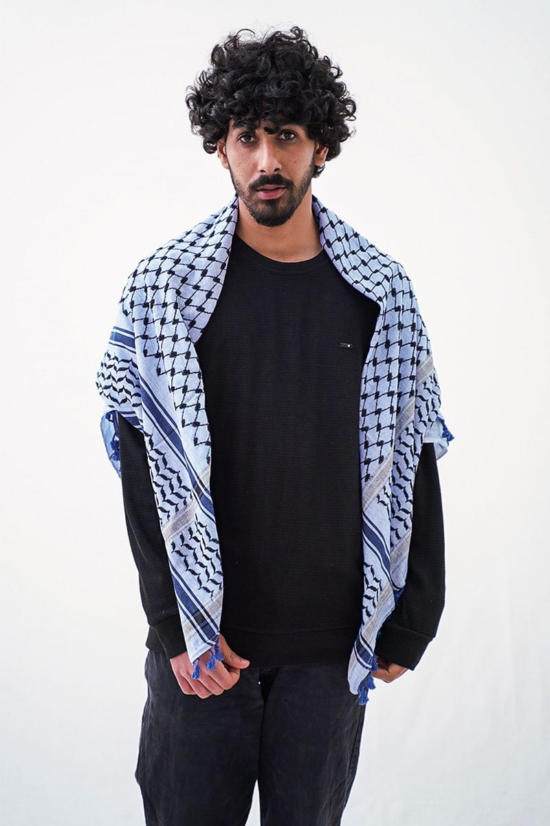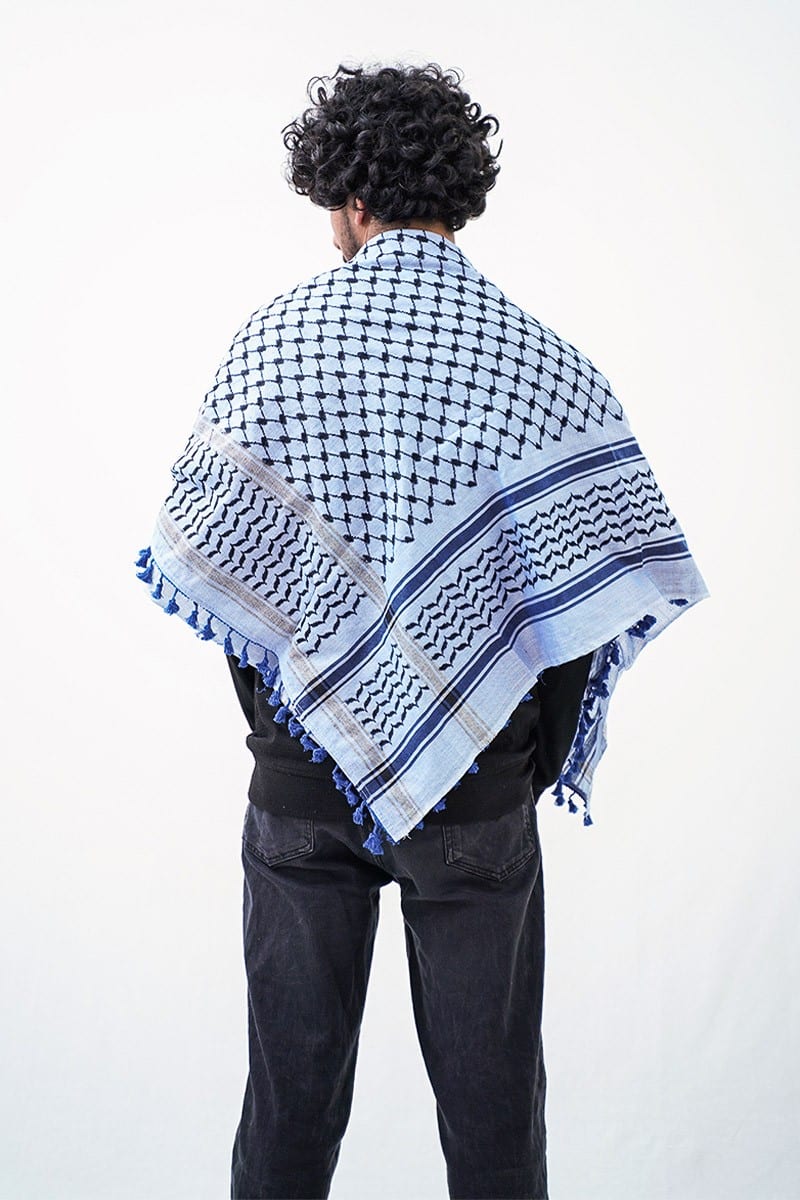Discover the timeless charm of our traditional blue Kufiya. Featuring a captivating black fisher net pattern on a serene blue background, this authentic Palestinian Keffiyeh evokes a sense of tranquillity and moderation, reminiscent of the vast sea and sky. Complete with blue tassels, it effortlessly combines casual style with traditional elegance. Whether for daily wear or special occasions, this versatile Shemagh effortlessly enhances any outfit, embracing the essence of Palestinian heritage.
